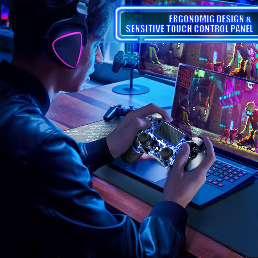 - 🎮【Featuers】The controller compatible with PS4 built-in dual motors and gyroscope which can give you timely instant vibration feedback and excellent motion sensing. Evolved analog sticks and trigger buttons allow for unparalleled accuracy with every move. Clickable touch pad, integrated light bar and audio jack offer exciting new ways to experience and interact with your games.