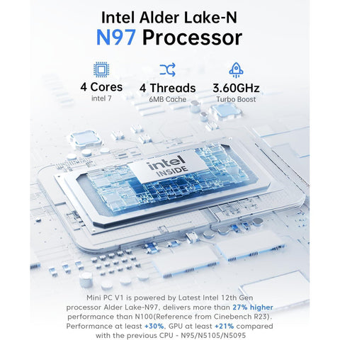 - POWERFUL N97 CPU - 11 Pro Mini pc is powered by Alder Lake N97 processor (up to 3.6GHZ, 4 cores and 4 threads), which is 45% higher performance than N150, N100, N95. The processing speed is lightning fast, you can easily handle heavy tasks, office or multitasking without lag.