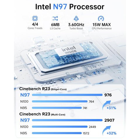 - 🔹[CPU: N97,which is faster and more powerful than the N150/N100] - Mini PC V1 is powered by 2024 Latest In-tel 12th Gen processor Alder Lake-N97(4Cores/4 Threads, 6M In-tel Smart Cache, 2.0GHz, MAX TO 3.6GHz) , delivers more than 27% higher performance than N100(Reference from Cinebench R23). Performance at least +30%, GPU at least +21% compared with the previous CPU - N95/N5105/N5095. Remarkably power-efficient at 15W, it outperforms its predecessors, even rivaling some mainstream mobile processors from the past. Whether it’s for business, family entertainment, school, research, or social media, this mini PC has your needs covered!