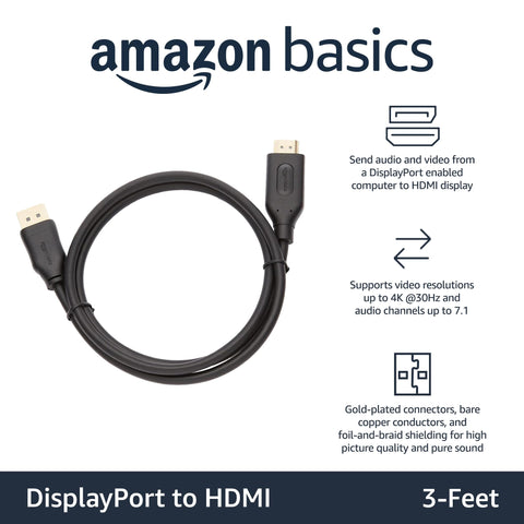 Amazon Basics DisplayPort (Source) to HDMI (Display) Cable, Uni-Directional, 3 Foot, Black