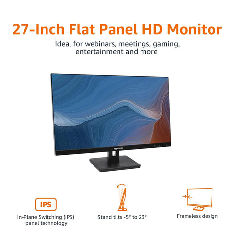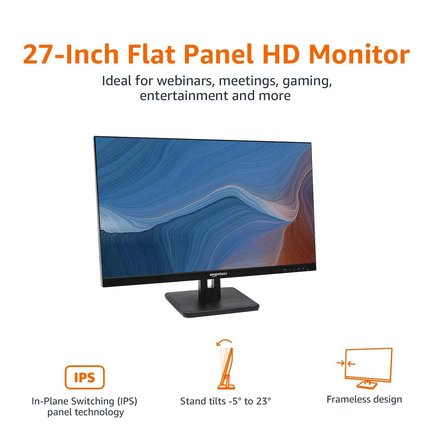 - Includes a 27-inch flat panel monitor, an adjustable stand, a power cord, an HDMI cable, and a user manual