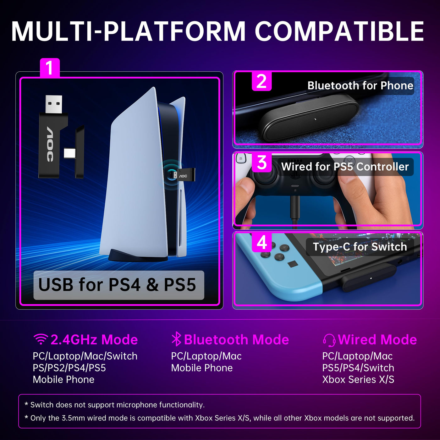 - 【4-in-1 Universal Connectivity】AOC PS5 Headset is equipped with USB-A, Type-C, Bluetooth 5.4, and 3.5 mm wired modes, this single gaming headset wireless plugs into consoles, mobile devices, and more—eliminating the need for multiple adapters or extra purchases. * Bluetooth modes are incompatible with PS5, PS4.