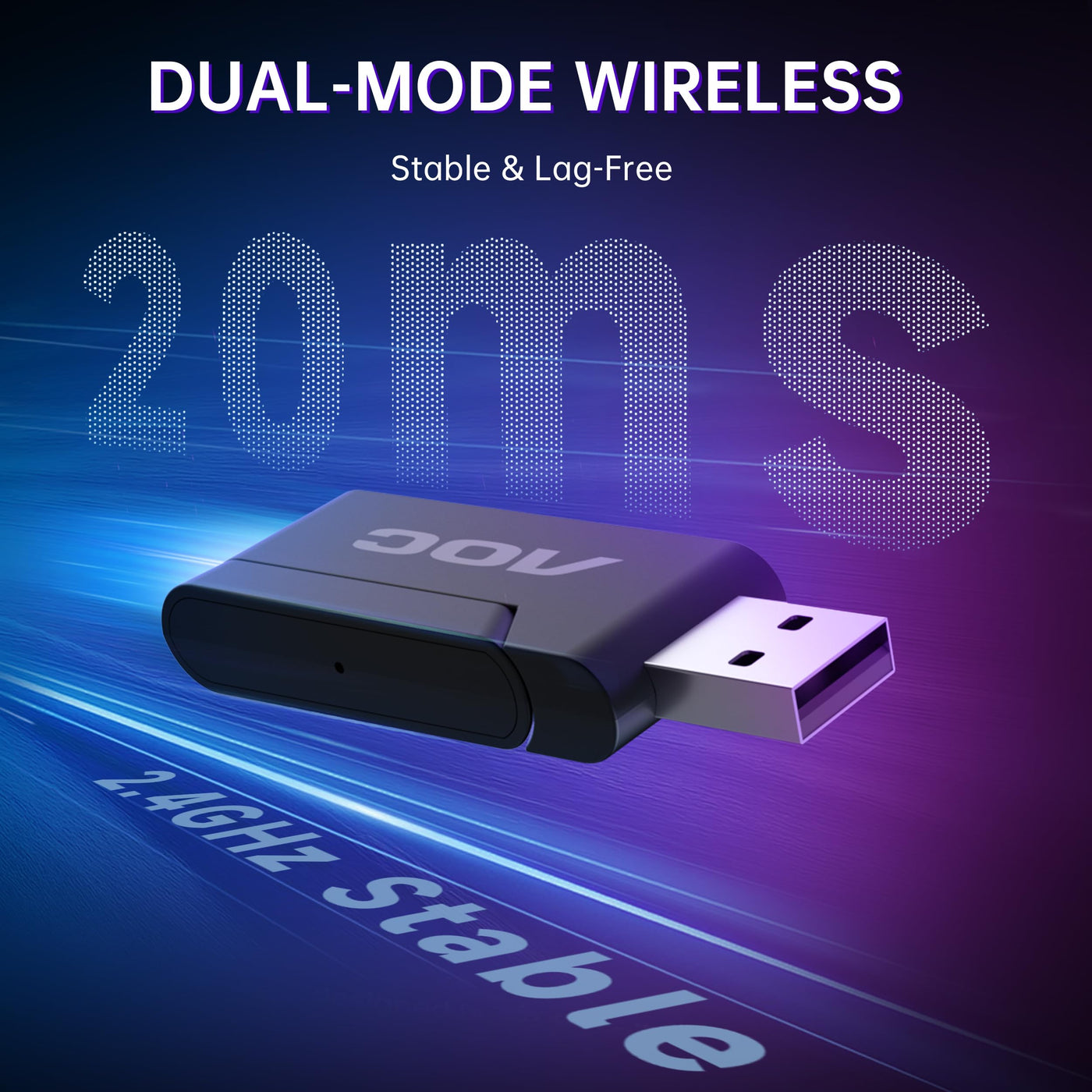- 【High-Resolution 7.1 Virtual Surround Sound】AOC PC Gaming Headphones is equipped with dual acoustic chambers and 50 mm graphene diaphragms, plus a built-in DAC delivering 96 kHz/24-bit output, this wireless gaming headset reproduces directional footsteps, reloads, and ambient effects with pinpoint clarity.