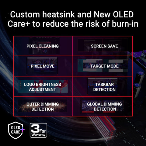 - Highly efficient custom heatsink, advanced airflow design, and ASUS OLED Care+ functions to reduce the risk of burn-in
