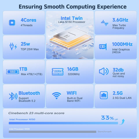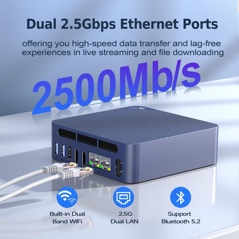 - 【2,5G Dual LAN+ WiFi 6 + BT 5.2】Beelink N150 Mini Computer 2.5G Dual LAN Ethernet port design provides more applications, such as firewall, multichannel aggregation, soft routing, lag-free experiences in live streaming, file downloading and VR etc. WiFi 6 provides a faster internet experience for browsing, streaming and gaming.Lower latency Bluetooth5.2 , more stable and efficient to connect to multiple wireless devices such as projector, printer, monitor, speakers and etc