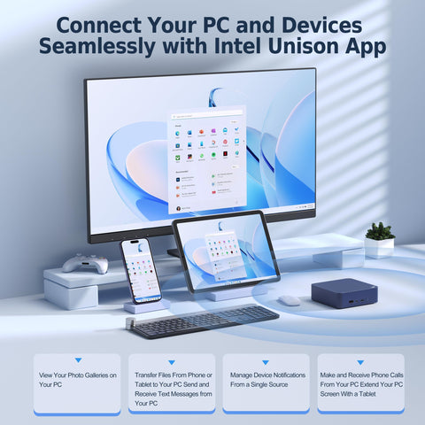 - 【Intel Unison App】Beelink EQ14 Mini PC Support Connect Your PC and Devices Seamlessly with Intel Unison App,View Your Photo Galleries on Your PC,end Your PC Screen With a Tablet, Make and Receive Phone Calls From Your PC,Transfer Files From Phone or Tablet to Your PC, Send and Receive Text Messages from Your PC, viewing galleries and transfering files, reducing frequency of picking up phone during working with PC