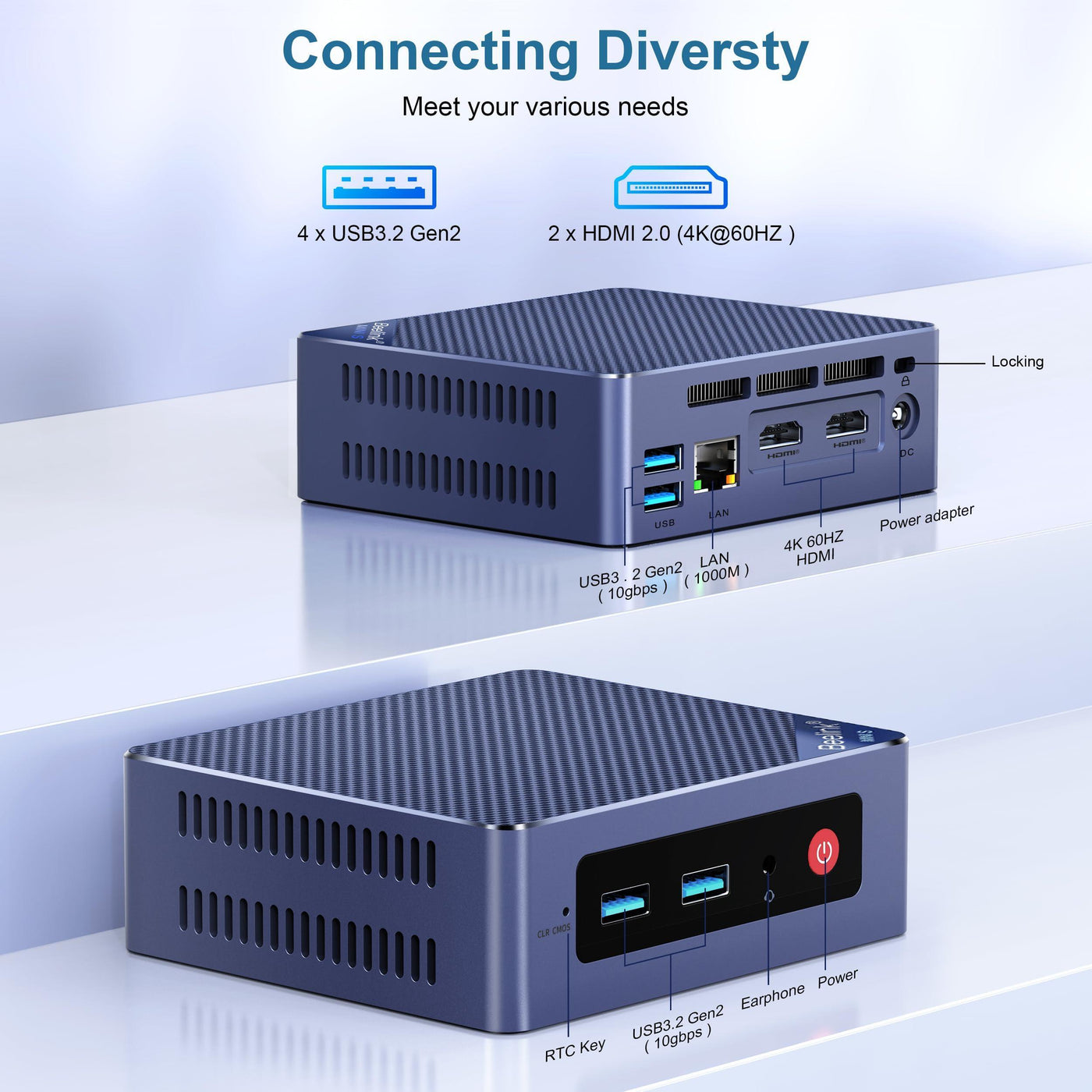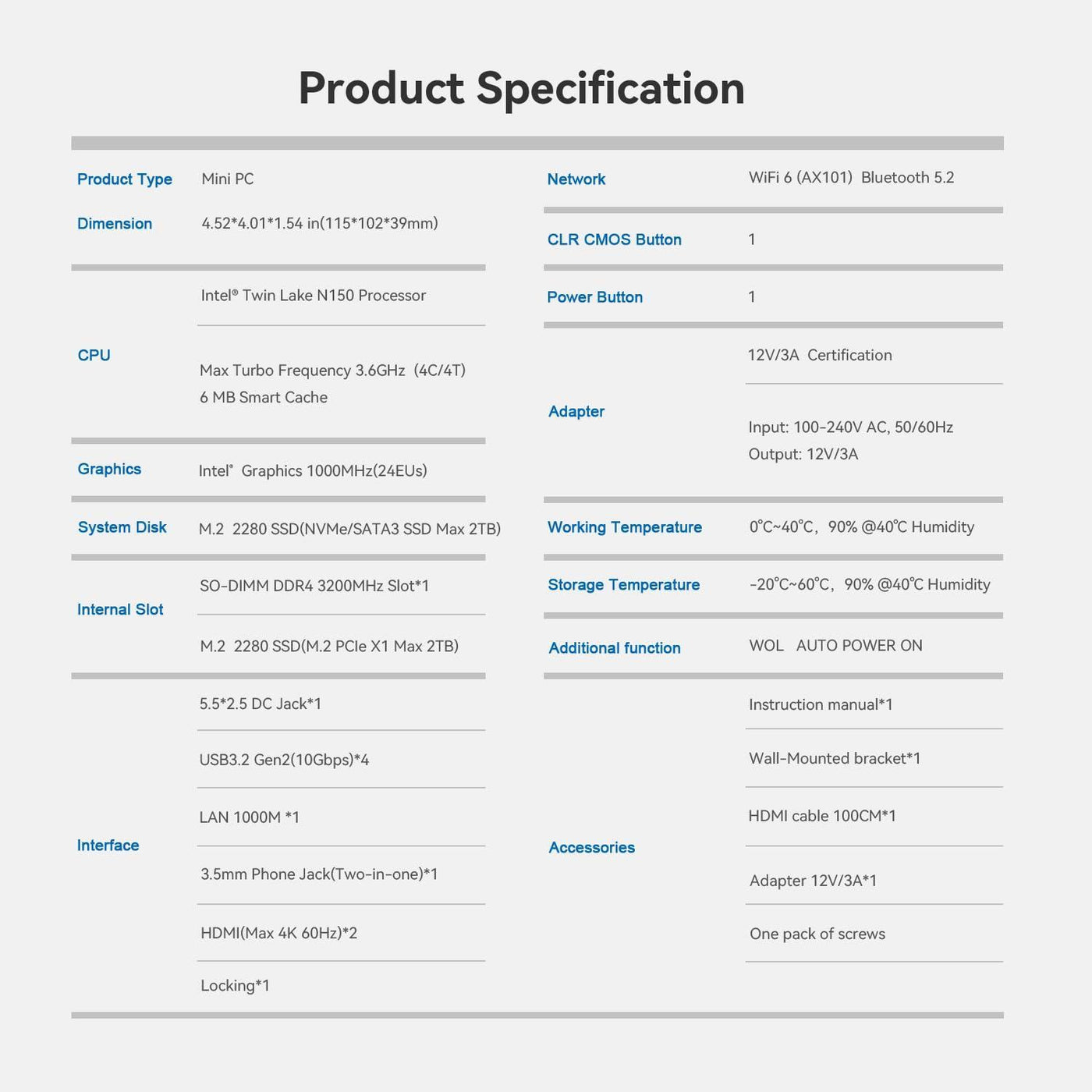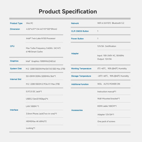 - 【Multi-interfaces】The Intel N150 mini pc features 2 HDMI ports supporting 4K@60Hz dual screen display, providing high-definition video output and flexibility of multitasking. With 4 x USB 3.2 Gen 2 ports boasting a transfer speed of up to 10 Gbps (which is 21 times faster than USB 2.0) seamless data transfer and device connectivity are effortlessly achieved. The RJ45 1000M port ensures stable wired network connections, perfect for high-speed internet access during tasks that demand reliability