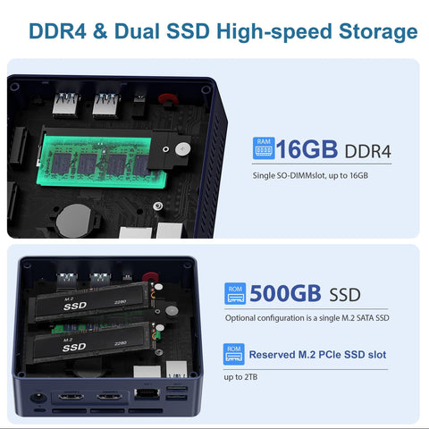 - 【16GB DDR4 + 500GB SSD】The mini pc is equipped with 16GB SO-DIMM DDR4 3200MHz for faster multitasking and smooth application switching. The 500GB M.2 NVMe SSD ensures fast boot times, rapid file transfers and ample storage space, eliminating slow loading times and ensuring snappy responsiveness. An additional M.2 PCIe 3.0 x1 interface (up to 2TB) is equipped to meet various usage needs