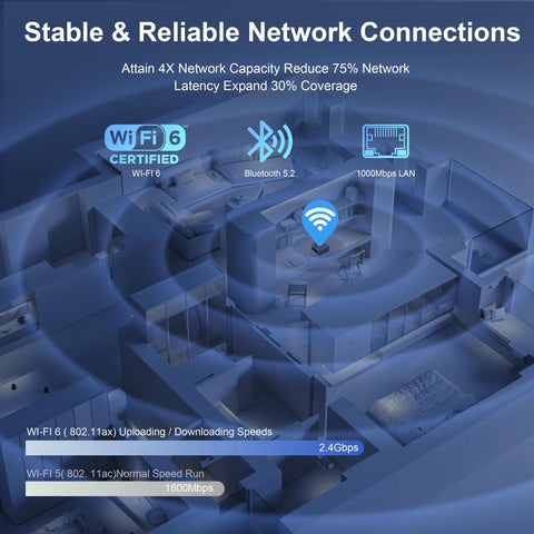 - 【High-Speed and Stable Network】The mini desktop pc supports Wi-Fi 6 (802.11 ax) for ultra-fast wireless connections, enabling smooth streaming and speedy downloads. Compared with Wi-Fi 5, Wi-Fi 6 is nearly 3 times faster, you can have a dedicated and undisturbed channel when playing games. Built-in Bluetooth 5.2 allows for effortless pairing with various peripherals, such as wireless keyboards, mice, earphones, monitoring camera, printer, monitor, TV, projector etc