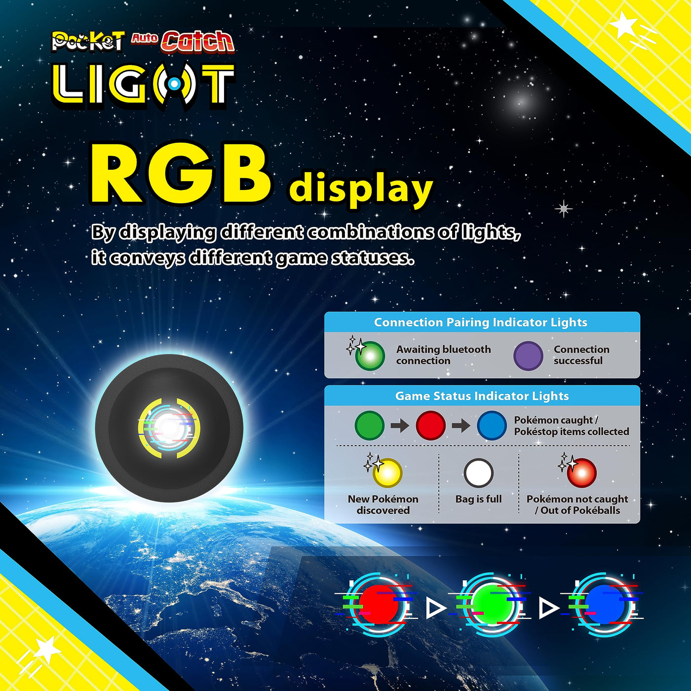 - 【Supports single and dual-player modes】 Connects via Bluetooth and supports two types of dual-account modes: A) One phone with split-screen (Android only) B) Two phones with separate accounts. (All Kind of Phone) RGB indicator lights show game status: Pokéball, Pokéstop, Bag, and more.