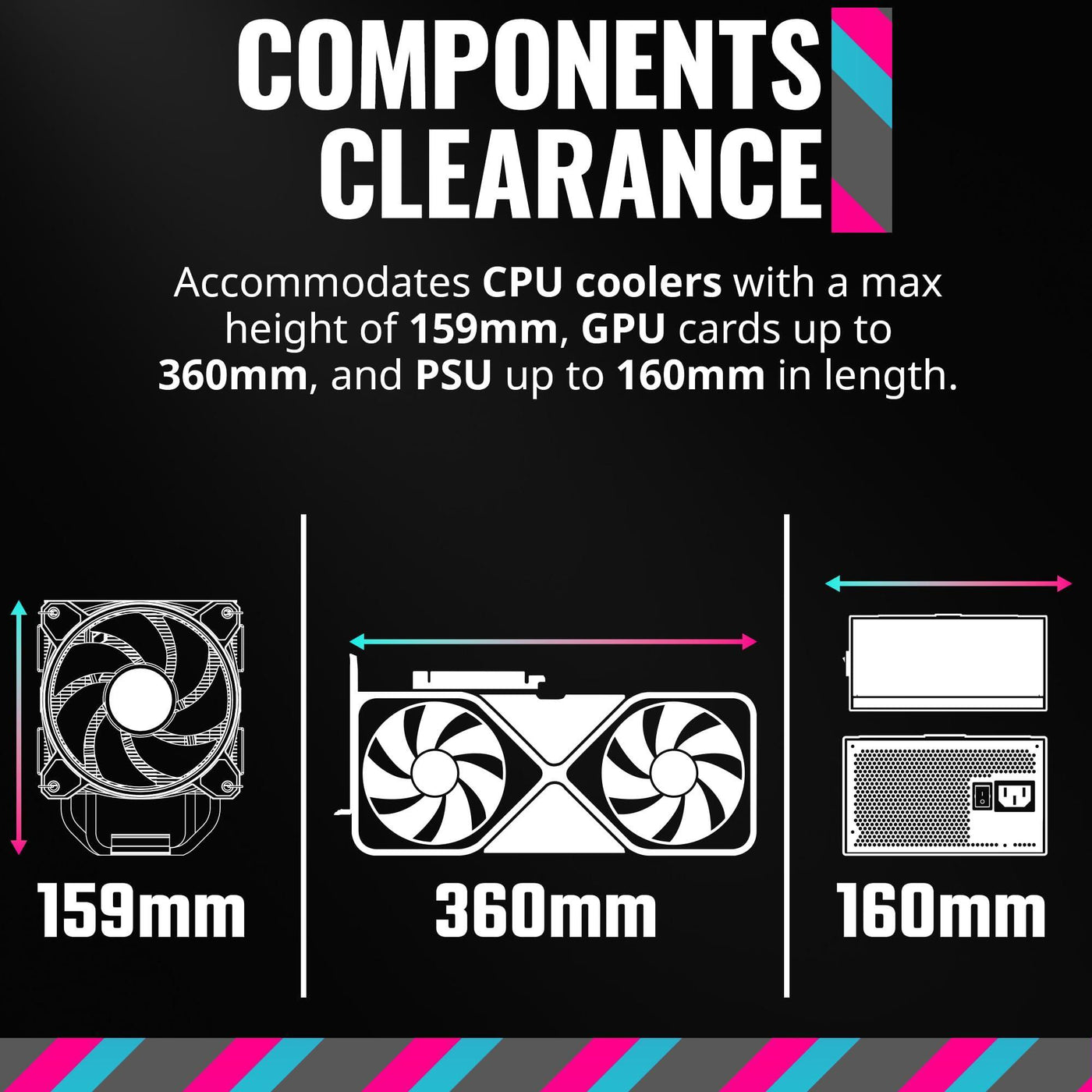 - Components Clearance: Accommodates CPU coolers with a max height of 159mm, GPU cards up to 360mm, and PSU up to 160mm in length.
