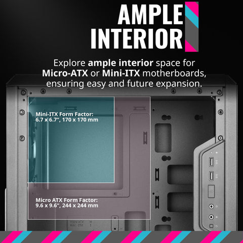 - Ample Interior: Explore ample interior space for Micro-ATX or Mini-ITX motherboards, ensuring easy and future expansion