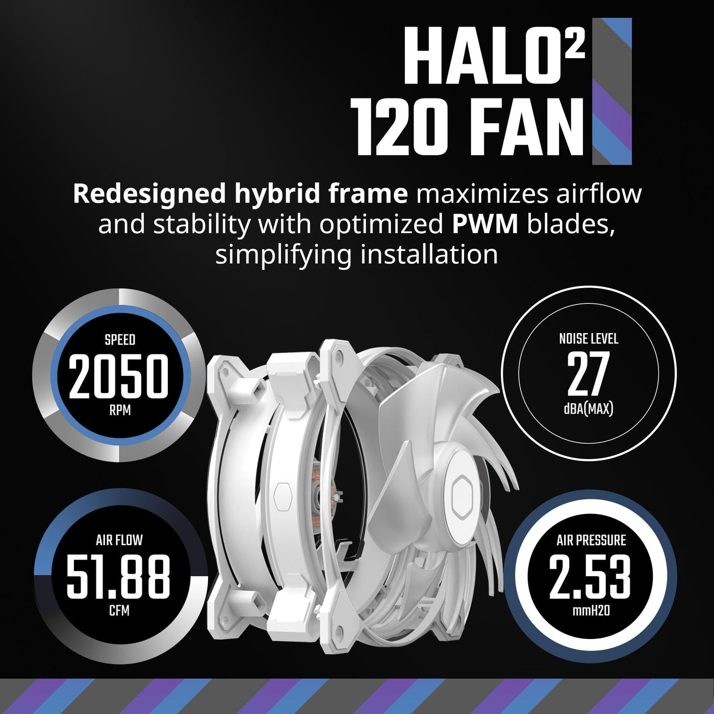 - Halo² 120 Fan: Redesigned hybrid frame optimal airflow and stability with optimized PWM blades, while simplifying the installation.
