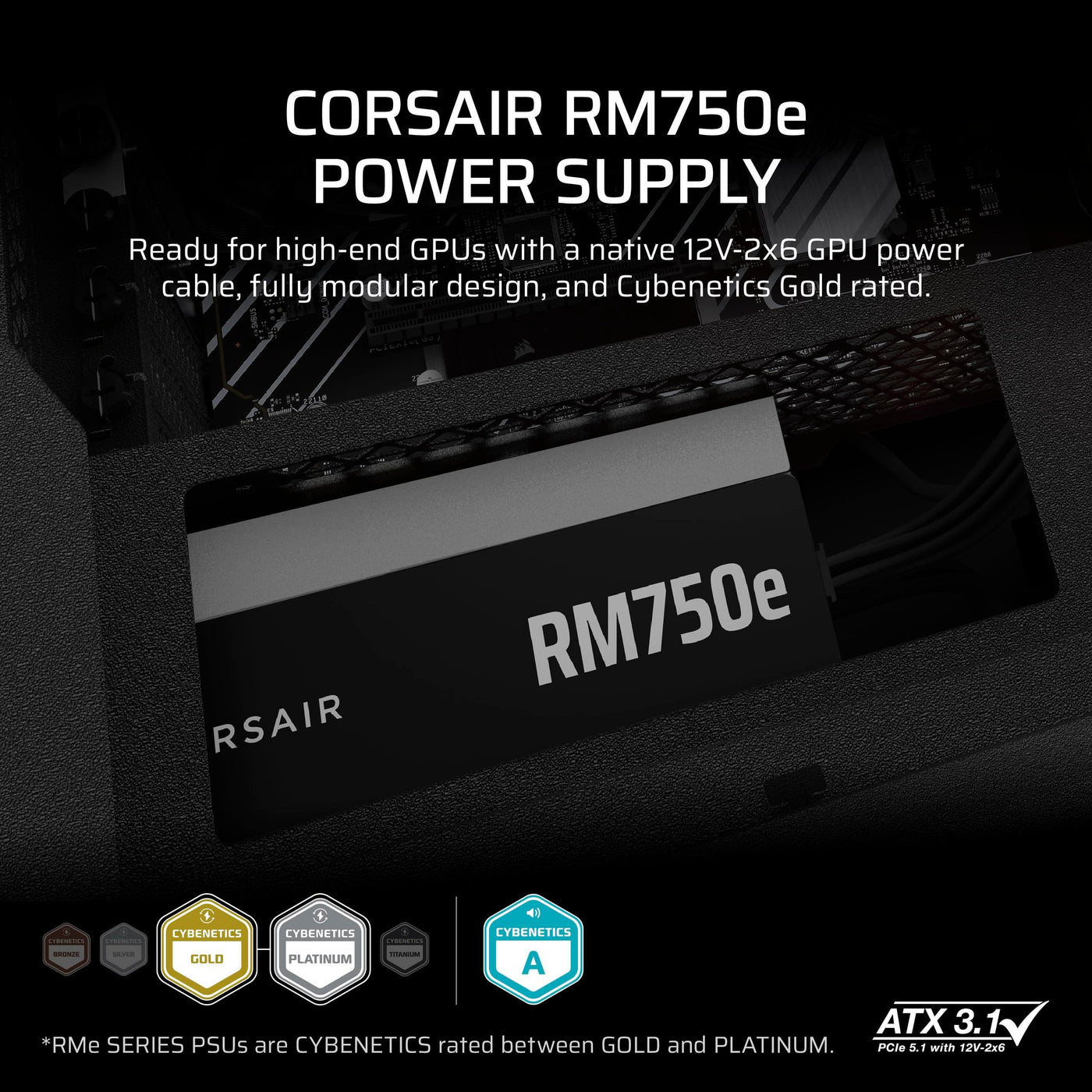 CORSAIR RM750e (2025) Fully Modular Low-Noise ATX Power Supply with 12V-2x6 Cable – ATX 3.1 & PCIe 5.1 Compliant, Cybenetics Gold Efficiency, 105°C-Rated Capacitors, Modern Standby Mode – Black