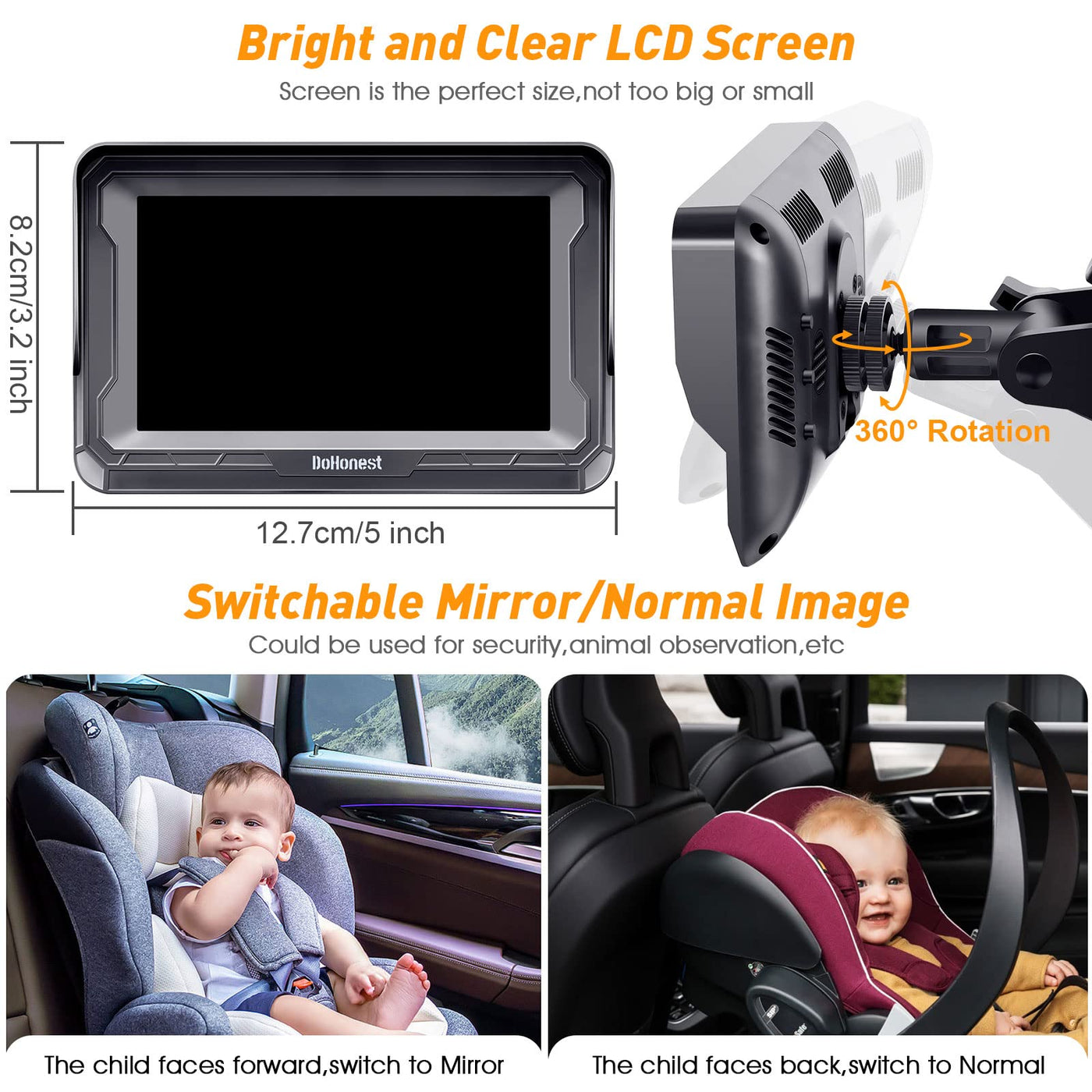 - DURABLE, HIGH-QUALITY MATERIALS FOR LONG-TERM USE: Built to withstand daily use, the DoHonest Baby Car Camera uses premium materials for lasting durability. Whether on daily commutes or road trips, it delivers long-term performance while ensuring your baby stays comfortable and safe with high-quality, reliable equipment.