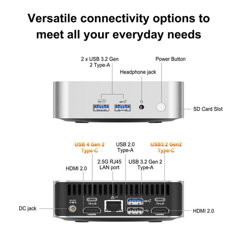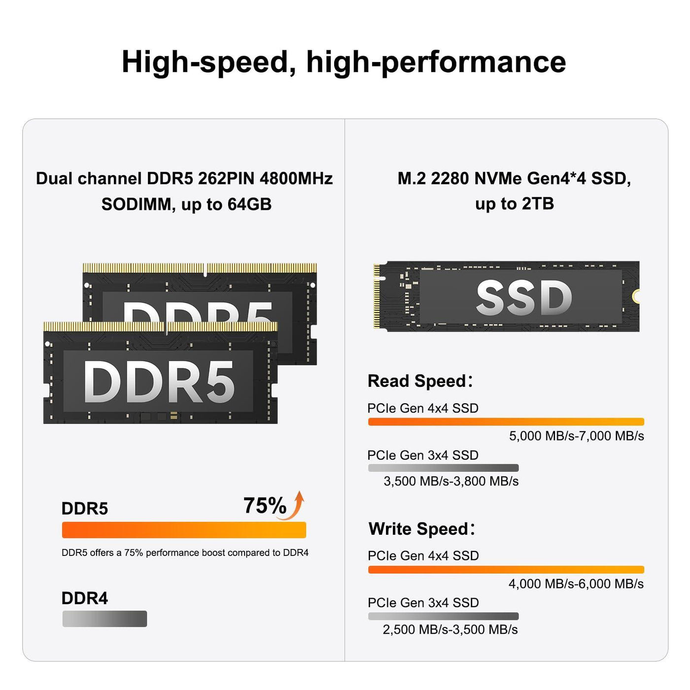 - Blazing-Fast Memory and Storage - Equipped with 32GB DDR5 RAM and 1TB PCIe Gen4 NVMe SSD, plus an M.2 2242 SATA SSD slot (2TB), the A6 desktop mini pc ensures lag-free multitasking and fast data access. Store thousands of photos, music tracks, or hours of HD video. This powerful combination is perfect for both professional workloads and personal media collections.