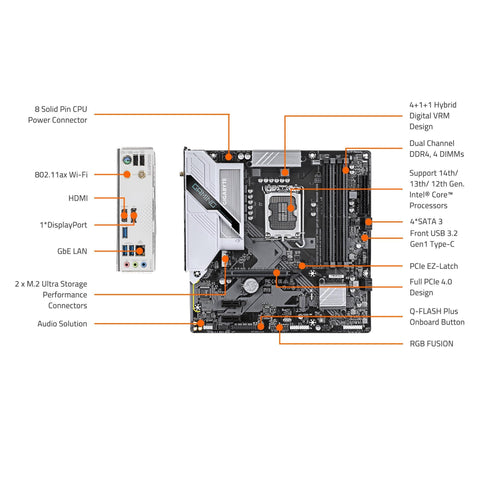 Details: Enjoy unparalleled performance with the GIGABYTE B760M GAMING PLUS WIFI DDR4. The GIGABYTE B760M GAMING PLUS WIFI DDR4 supports 14th and 13th Gen Intel Core Processors. Unlock your gaming potential with GIGABYTE B760 Motherboards. GIGABYTE B760 motherboards come with upgraded power design, high grade storage standards, and outstanding connectivity that enables you to optimize your performance. Claim what is yours