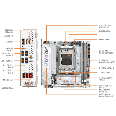 Details: The X870I AORUS PRO ICE supports AM5 Processors and features unparalleled performance. GIGABYTE X870 motherboards come with upgraded power design, high grade storage standards, and outstanding connectivity that enables you to optimize your performance.