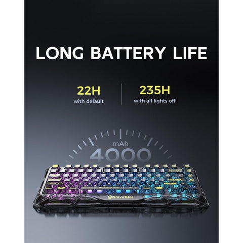 - 🔋Reliable Battery Life: Featuring a lightweight 4000mAh lithium-ion battery, the GravaStar Wireless Keyboard stores enough power that you might even forget it needs charging. With up to 235 hours between charges*, it can keep up with the longest marathon gaming sessions, anywhere they may take you. When it finally does need a charge, connect the included USB-C cable to replenish your power without interrupting your game.