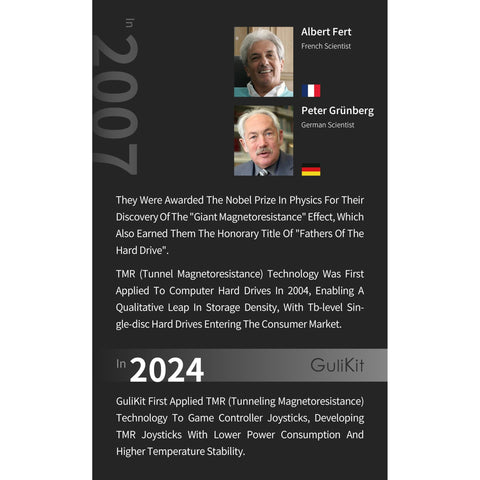 - Upgraded Anti-Drift TMR Joystick Technology – Evolved from GuliKit's patented Hall Effect joystick, the more advanced TMR (Tunnel Magnetoresistance) thumb stick same works with contact-less magnetic field sensing mechanism to eliminate stick drift cause,while offers ultra-low power consumption, enhanced stability, drift-free long lasting durability, high-precision and silk-like smoothness.