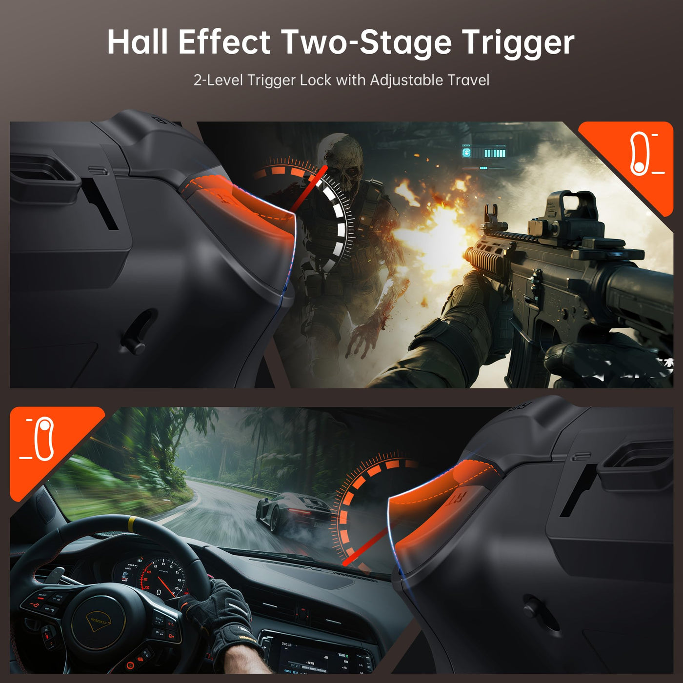 - 🔧 Precision Hall Effect Joysticks & Dual-Stage Triggers: Featuring drift-free Hall sensors, the joysticks have a durability of up to 5 million uses and a precision deviation of less than 1%, delivering smooth and accurate control. Dead zones can be finely adjusted from 0–50% to create a personalized feel. The dual-stage trigger locks allow you to switch seamlessly between quick-fire and full-range control, perfect for FPS shooters, racing, and action games.