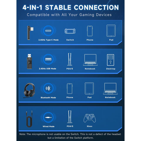 - 4-IN-1 WIRELESS HEADSET - Enjoy wireless gaming through 2.4GHz USB, Bluetooth, or wired connection. Compatible with PC, PS5, PS4, Switch, the gaming headsets suit all your gaming needs.
