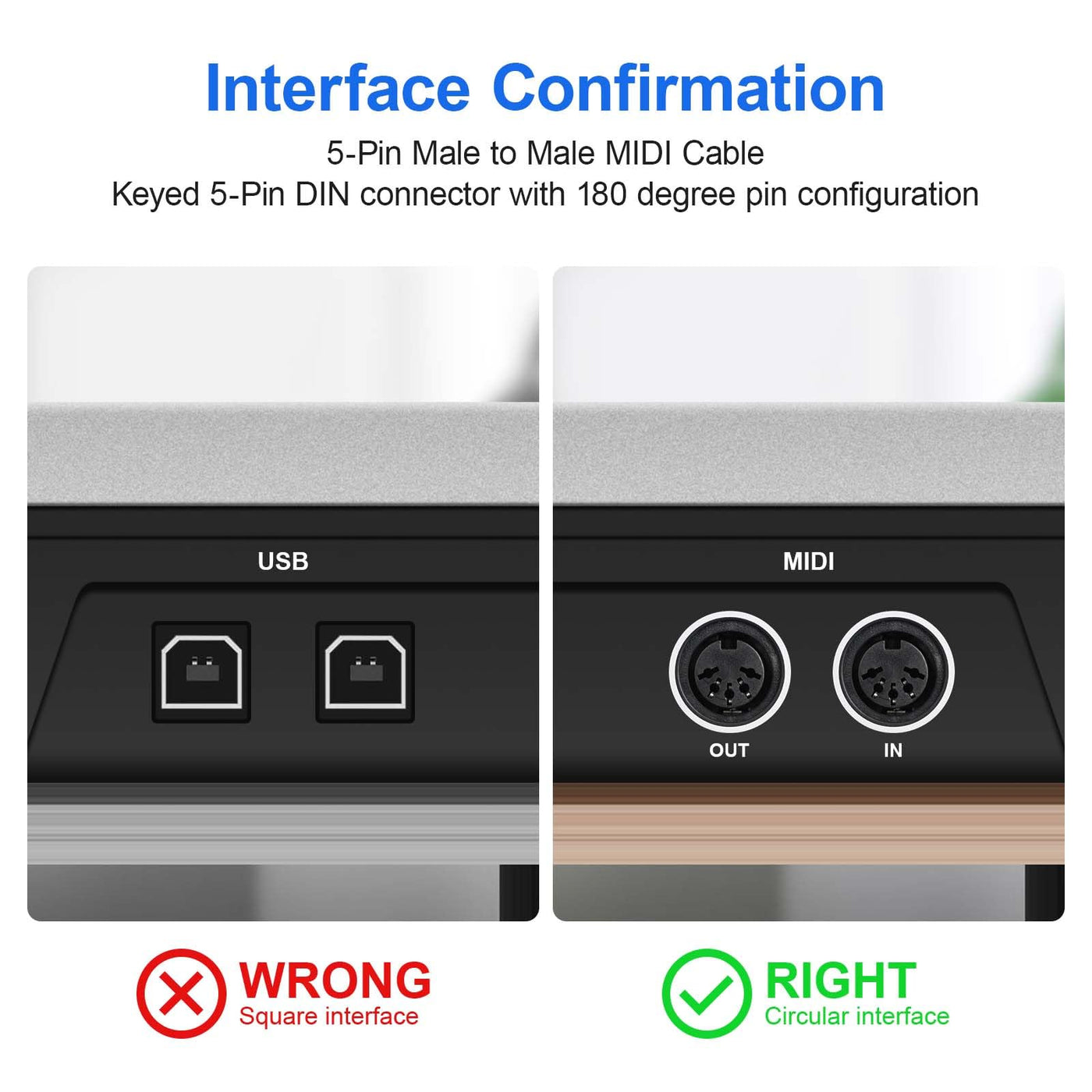 - INTERFACE CONFIRMATION – This standard 5-Pin MIDI Cable is designed to interconnect MIDI devices, each of the 5-Pins is wired separately through a dedicated end-to-end pin-to-pin connection. Keyed 5-pin DIN connector with 180 degree pin configuration, and this model does not have a USB interface, please confirm the interface before order.