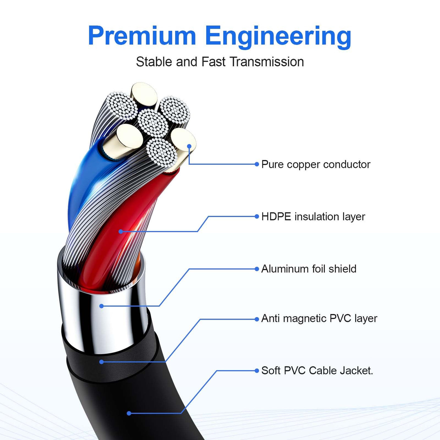 A: 2 Times quantity OFC Cores + Premium Connector, 3 Times Durability.
