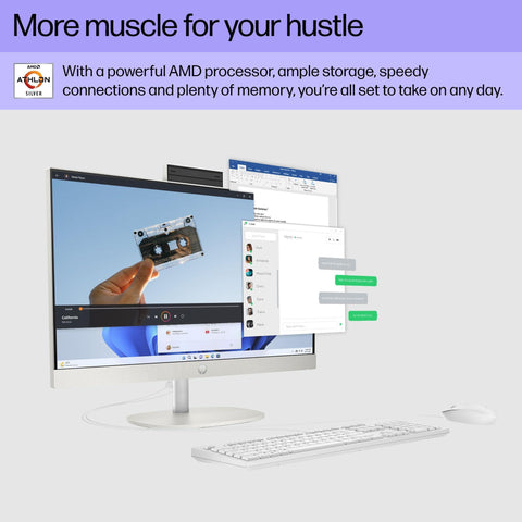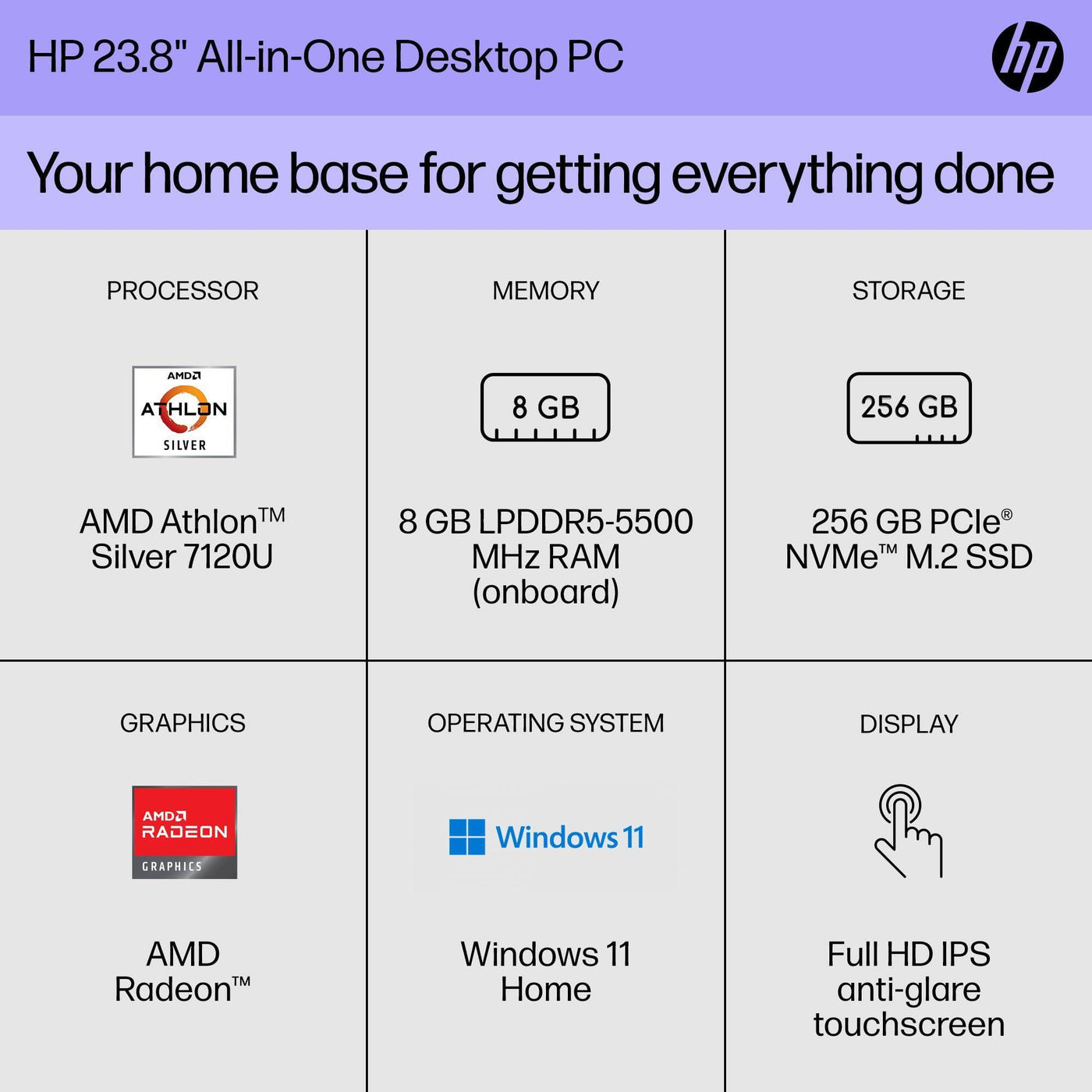 Details: The HP 23.8"" All-in-One Desktop takes caring for the planet to the next level. This contemporary, ultra-slim desktop was designed with the planet in mind, while turning your to-do lists into to-done lists with the reliable processing power of the AMD Athlon Silver 7120U, upgraded memory, and enhanced multitasking features for heightened performance. Plus, this HP desktop is EPEAT Gold registered and ENERGY STAR certified. HP is here to help. This HP computer comes with 1-year limited hardware warranty and 1-year limited technical support for software and initial setup with 24-hour, 7 days a week web support when shipped from and sold by Amazon.com. ENERGY STAR and the ENERGY STAR mark are registered trademarks owned by the U.S. Environmental Protection Agency. Based on U.S. EPEAT® registration according to IEEE 1680.1-2018 EPEAT®. EPEAT® status varies by country. Visit www.epeat.net for more information.