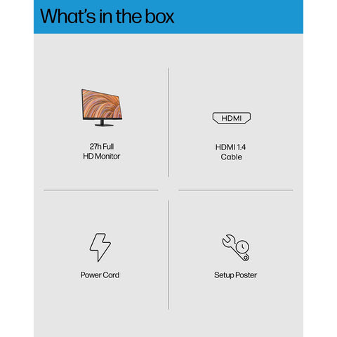 Details: Hybrid workers, rejoice! The HP P27h Full HD Monitor brings your projects and content to life. With this monitor’s 75Hz refresh rate and boosted audio from built-in dual speakers(1), your work will appear crisp while you enjoy stellar sound quality. Never worry about your comfort; this 27 HP monitor’s 100mm height/tilt capabilities (2) let you tilt and adjust it to the perfect viewing position for you. Easily control your settings with the intuitive joypad control and the HP Display Center (3) for an elevated work experience. Say goodbye to desktop clutter—the sleek design of this HP 27 monitor, along with built-in HDMI, DisplayPort™, and VGA port connectivity, let you work more efficiently while keeping your workspace clean. Built with 85% recycled ITE plastics and shipped in 100% recyclable packaging (4), this HP 27-inch computer monitor is designed with the environment in mind and meets the latest energy efficiency and environmental standards for tech and IT with EPEAT® Gold rating and ENERGY STAR® and TCO certifications. (1) All performance specifications represent the typical specifications provided by HP's component manufacturers; actual performance may vary either higher or lower. (2) According to HP's internal analysis on the size difference of the last generation P Series and the HP P22h G5, P24h G5, and P27h G5. (3) Host PC requires Windows 10 or higher. HP Display Center is available on the Microsoft store. HP Display Manager software agent must be running on a web server and host PC. Some limitations may apply to legacy monitors. (4)100% outer box/corrugate cushion packaging made from sustainably sourced certified and recycled fibers. Fiber cushions made from 100% recycled wood fiber and organic material. Any plastic cushions are made from >90% recycled plastic. Excludes plastic bags and plastic foam sheeting. ITE Derived Closed Loop Plastic percentage is based on the definition set in the IEEE 1680.1-2018 standard. Based on US EPEAT® registration according to IEEE 1680.1-2018 EPEAT®. EPEAT® status varies by country. EPEAT® Gold registered in most countries. See www.epeat.net for registration status by country.