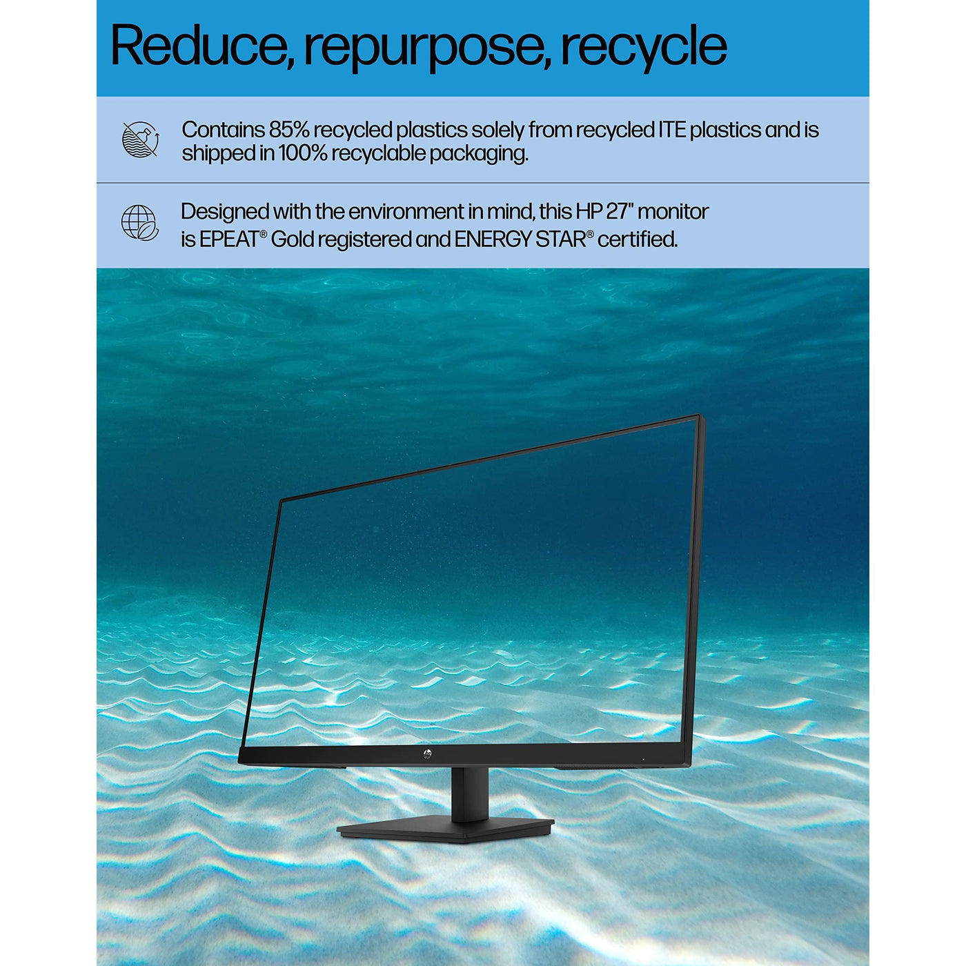 - SUSTAINABLE DESIGN – Designed with the environment in mind; this HP 27-inch monitor is made with 85% recycled ITE plastics and is shipped in 100% recyclable packaging; plus, it’s EPEAT Gold rated as well as ENERGY STAR and TCO certified.