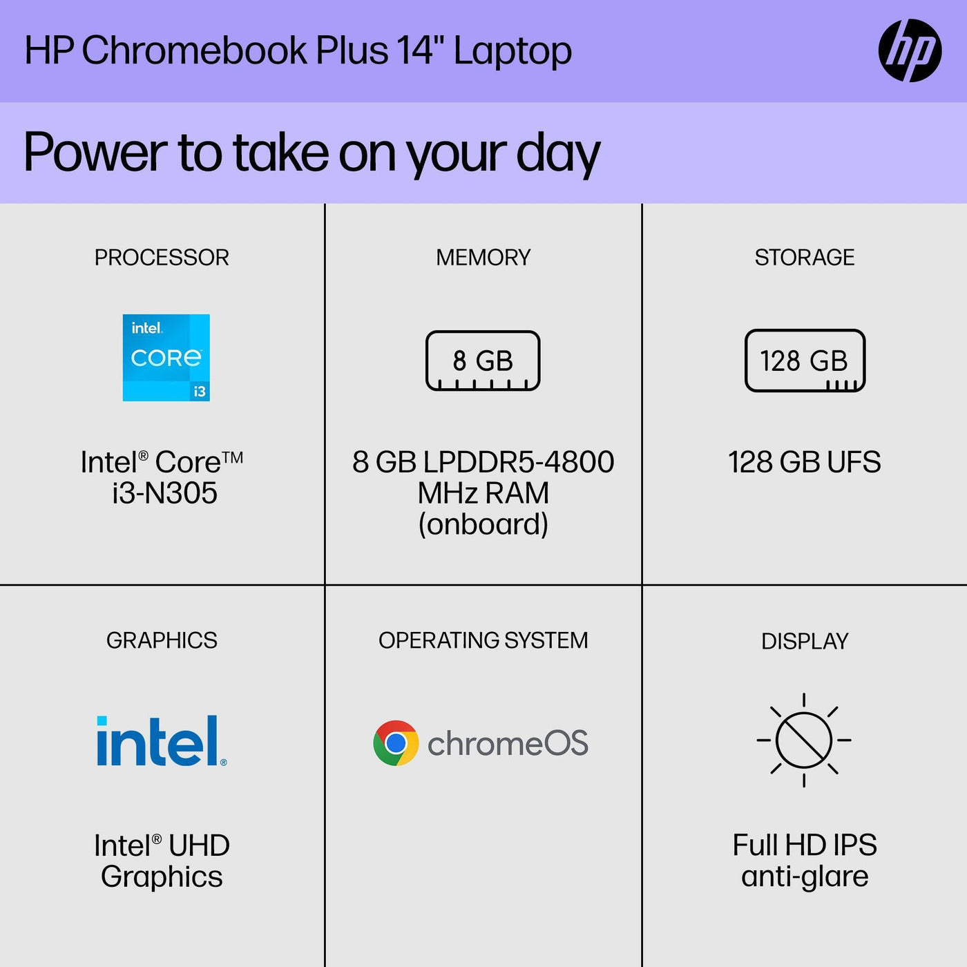Details: The HP Chromebook Plus 14” Laptop lets you take on the day with an Intel processor paired with the easy to use and easy to love Chrome OS. With plenty of memory and wireless connectivity it is easy to check everything off your list. Plus, this laptop is designed to be more sustainable using ocean-bound plastic and post-consumer recycled plastics. The HP Chromebook Plus 14” Laptop comes with a 45 W USB Type-C power adapter and goes from 0 to 50% charge in 45 minutes. Plus, made with the planet in mind, this HP notebook is EPEAT Gold registered and ENERGY STAR certified. HP is here to help. This HP computer comes with 1-year limited hardware warranty and 90-days limited technical support for software and initial setup with 24-hour, 7 days a week web support when shipped from and sold by Amazon.com.ENERGY STAR and the ENERGY STAR mark are registered trademarks owned by the U.S. Environmental Protection Agency. Based on U.S. EPEAT registration according to IEEE 1680.1-2018 EPEAT. EPEAT status varies by country. Visit www.epeat.net for more information.
