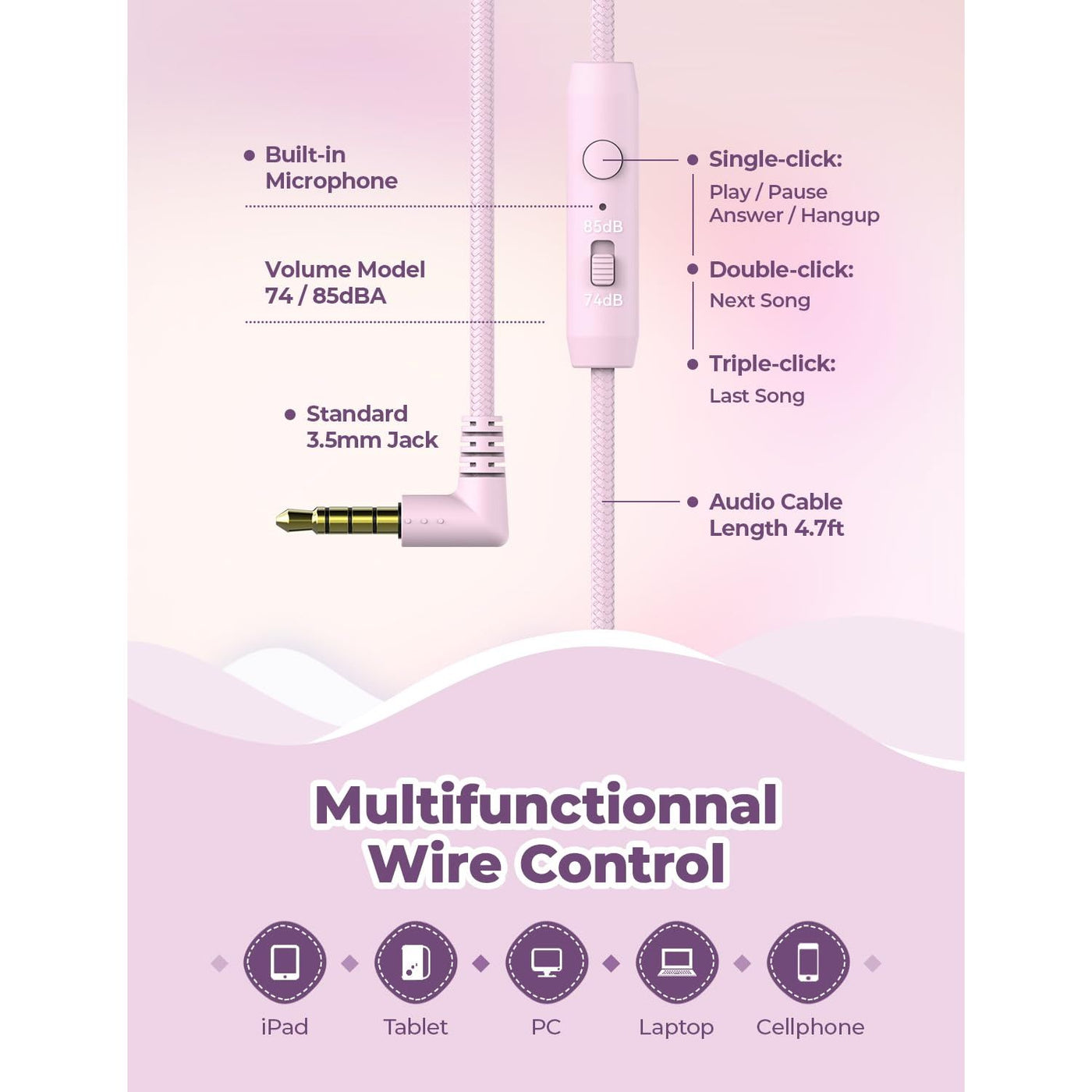 - [2-Level Volume Control Switch]: Specially designed for children, the kids headphones can be limited to a sound level of 85dB to prevent damages to kid's ears in daily life.