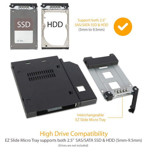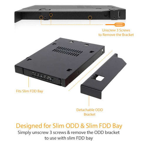 - Fits 1 x 5mm to 9.5mm height 2.5” SATA HDD / SSD in a 12.7mm slim ODD bay.