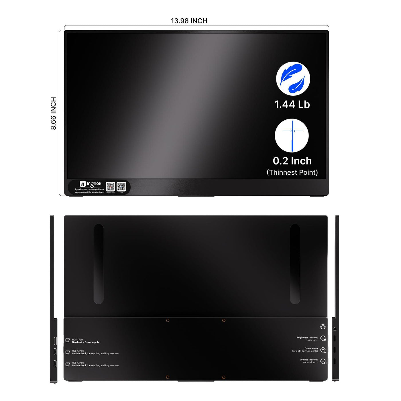 - 【Ultra-Thin and Portable, Easy to Carry】The Ingnok Portable Monitor is only 0.5 times the thickness of an Phone and weighs just 1.46lb. It’s incredibly easy to carry whether you’re traveling or working at your desk, providing a hassle-free experience.