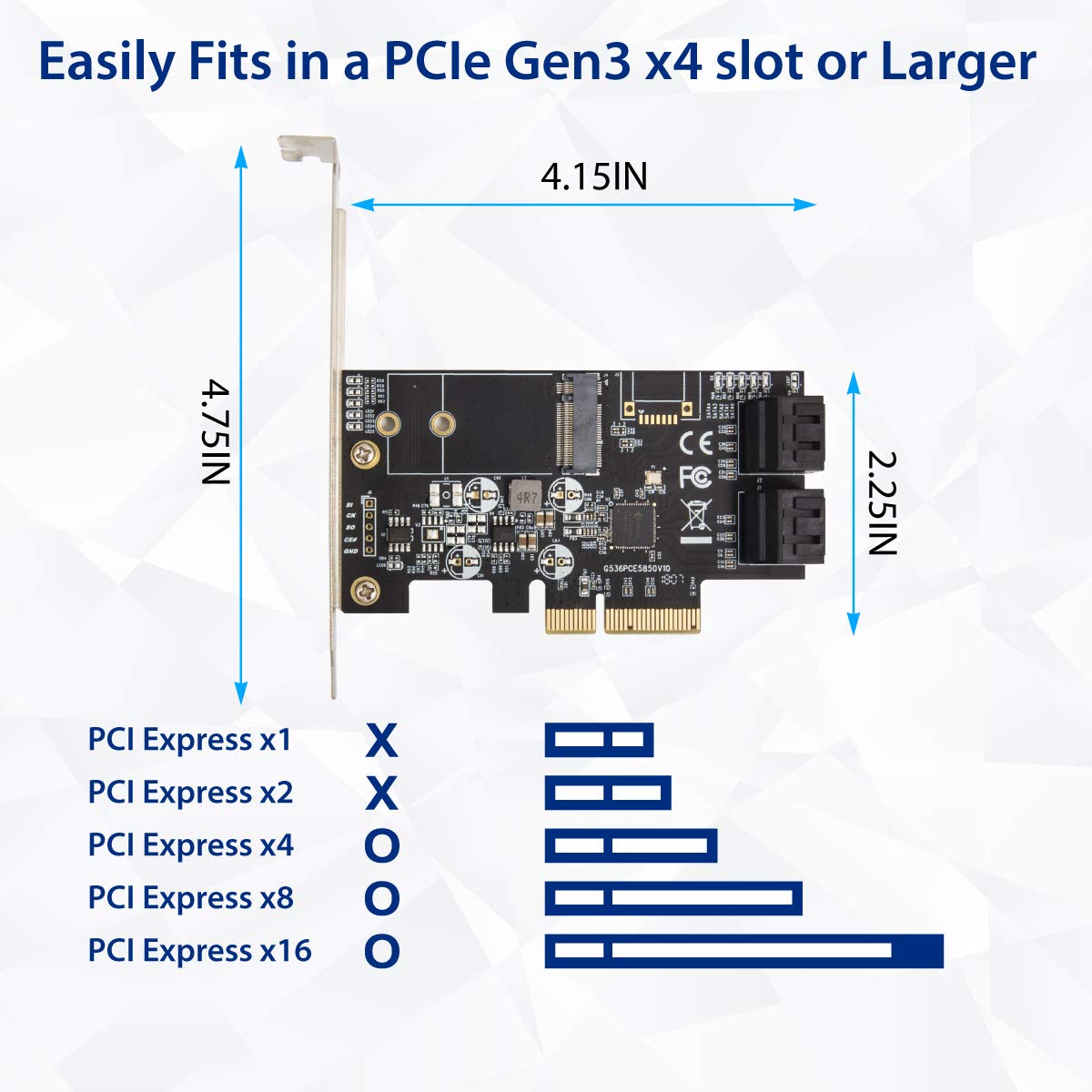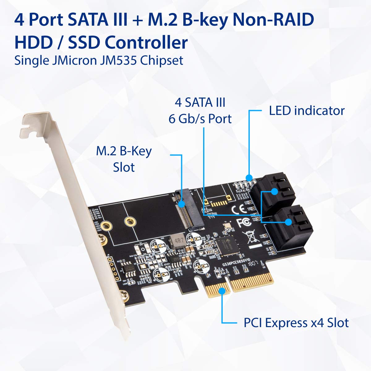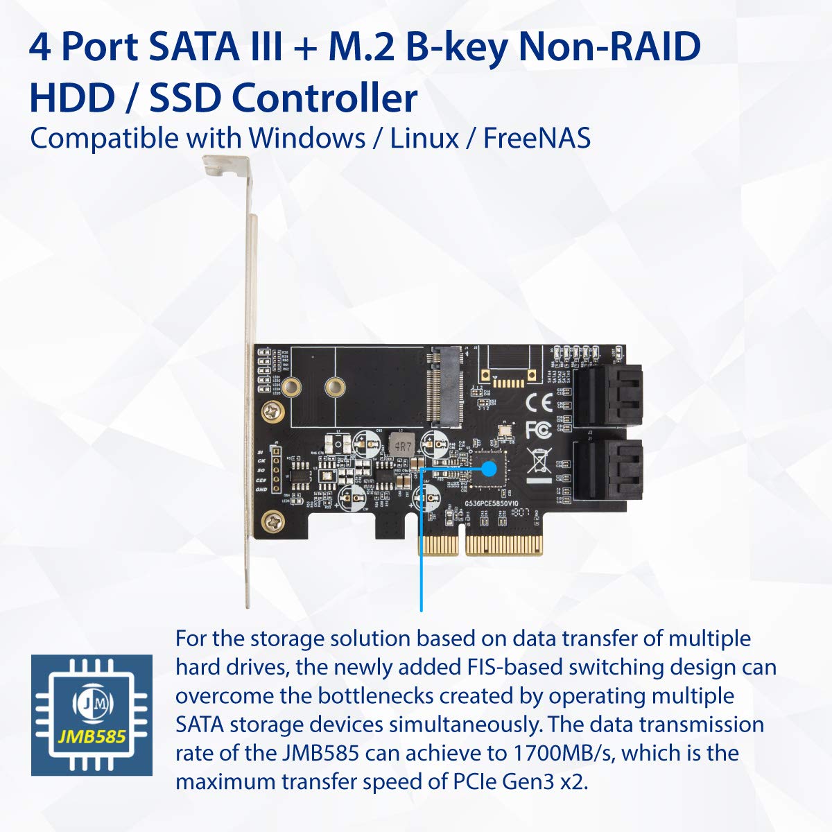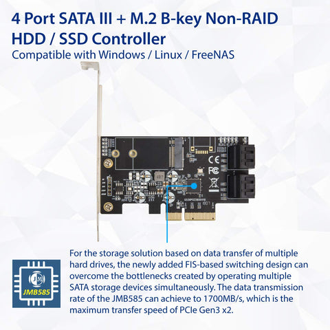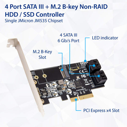 Details: Internal 4 port non-raid SATA III 6GB/s with M.2 B-Key 22x42 PCI-E x4 controller card for desktop PC support SSD and HDD with low profile bracket. JMB585 chipset