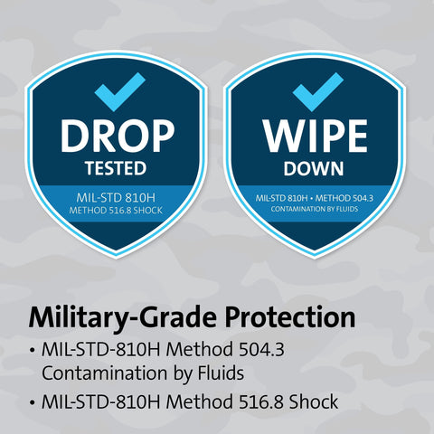 - [Military-Grade Protection] Ready for anything, this case meets wipe down (MIL-STD-810H Method 504.3 Contamination by Fluids) and drop testing (MIL-STD-810H Method 516.8 Shock) standards