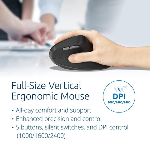 - [Full-Size Vertical Ergonomic Mouse] Contoured natural slope keeps the wrist in a neutral handshake position to support all-day ergonomic comfort and productivity. Full-size vertical design offers enhanced precision and control and comfortably supports larger hands