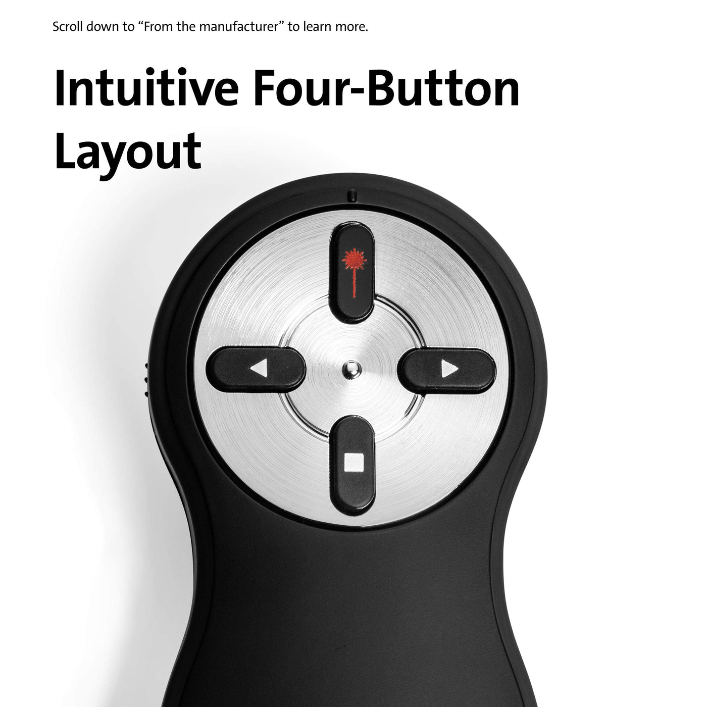 - Intuitive four-button layout lets you easily go forward and back on your PowerPoint or Keynote slides, while the other two buttons let you hide your screen and use the red laser pointer.