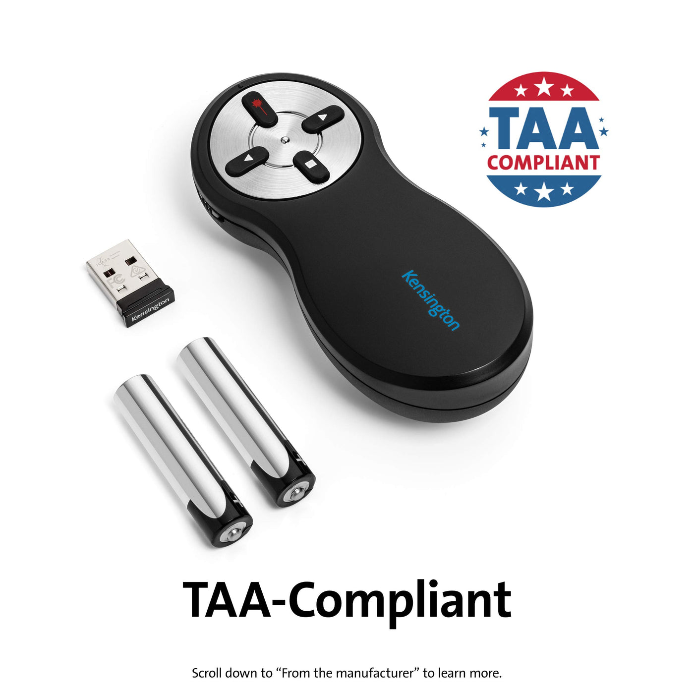 - Plug-and-play 2.4GHz wireless connection with 65-foot range delivers secure and reliable performance through a compact USB receiver, so you can roam the room or auditorium with ease during your presentation. No driver required.