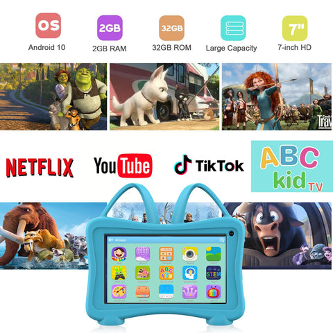 - 【Kids Tablet with Case Included & Eye Protection Screen 】The kid tablet comes with a durable kids-proof case, protecting the tablet from bumps and drops. Designed with low blue light technology, the 7 inch child tablet uses a premium LCD screen with 1024 x 600 HD display that adjusts the brightness to a comfortable reading and gaming experience to protect your child's eyes
