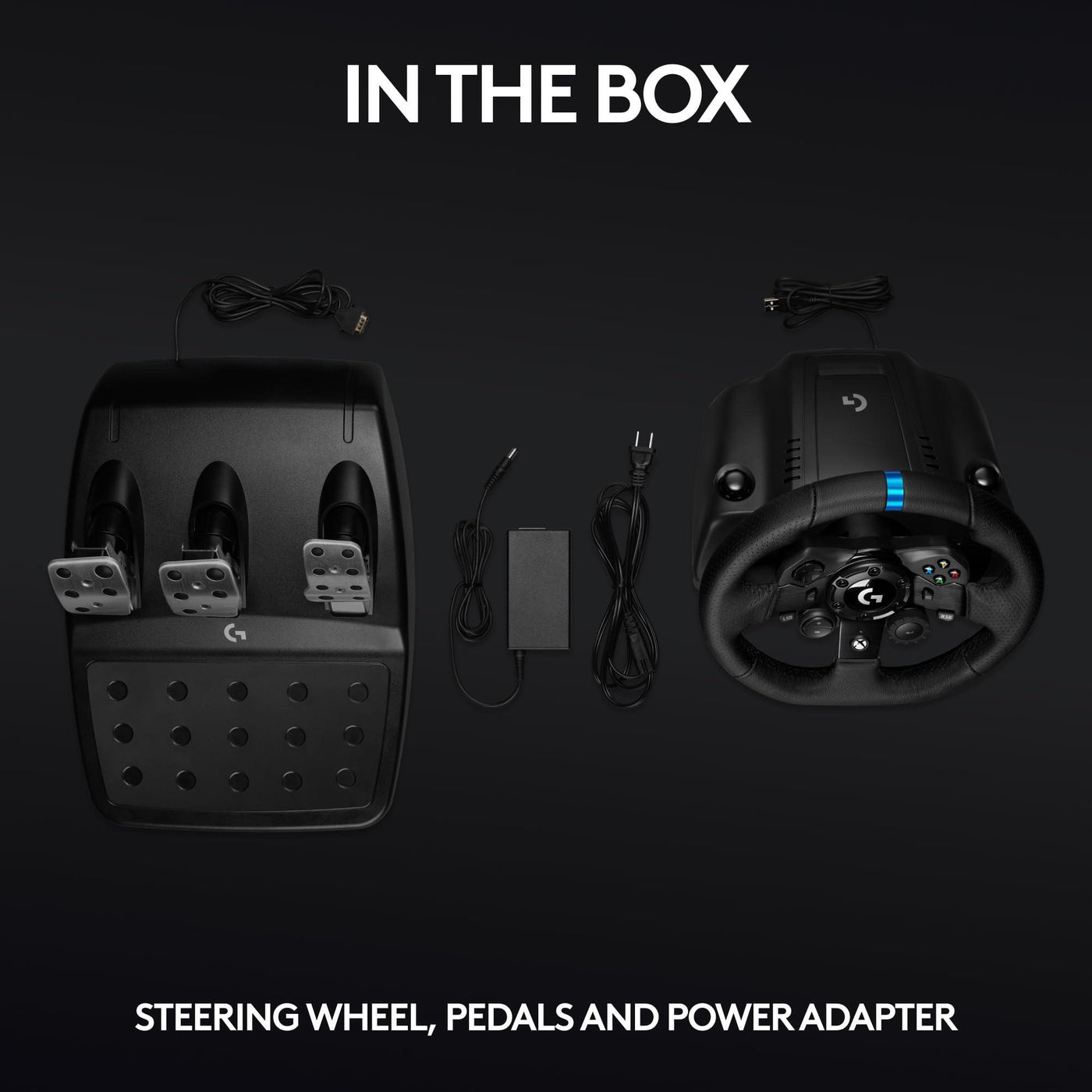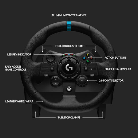 Details: Logitech G923 for Xbox Series X|S, Xbox One and PC is a high-performance racing wheel that revolutionizes the racing experience. Re-engineered to support a next-generation feedback system, G923 features TRUEFORCE high-definition force feedback that dials into game engines to deliver higher-fidelity realism. Feel the pistons pumping, the gravel crunching, and every shift, drift, and hairpin turn like never before. True racing comes from within. An all-new progressive brake pedal recreates a pressure-sensitive brake system, while a programmable dual-clutch system simulates a real race car launch assist in supported games. Get more traction with less smoke. An LED RPM indicator and 24-point selection dial provide additional control and information directly on the wheel.