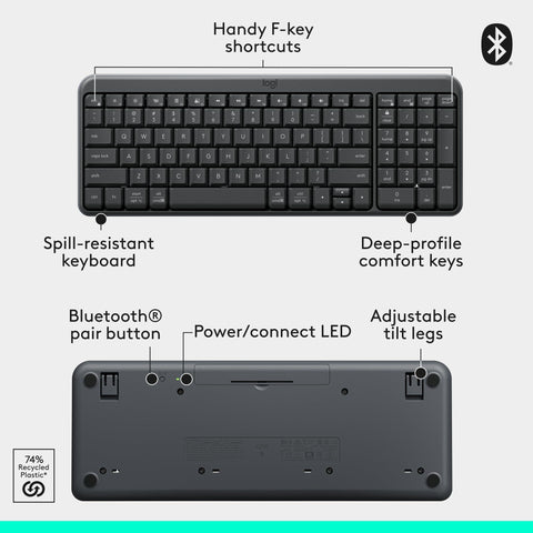 Details: The Logitech MK250 Bluetooth® mouse and keyboard combo features effortless Bluetooth® connectivity. It connects in seconds without the need for a dongle, freeing up USB ports and ensuring a clutter-free workspace. Built to last, the K250 keyboard has a spill-resistant design (2) for reliable performance, making it an ideal choice for a busy home. The comfortable ambidextrous M196 mouse shape and fast, responsive, deep-profile K250 keys give you a familiar and consistent feel. Despite its compact size, the K250 keyboard includes a numpad and all essential function keys, providing full functionality in a space-saving design perfect for tight spaces. MK250 is made to last with plastic parts using a minimum of 66% (mouse) and 64% (keyboard) recycled materials. (3)(4) This combo underscores Logitech's commitment to sustainability, offering a durable product.