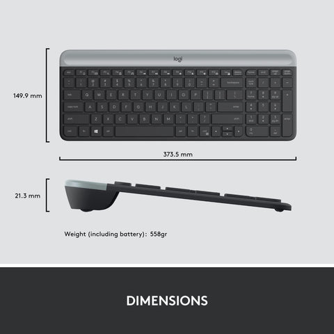Details: Minimalist. Modern. Slim. Introducing the MK470 Slim Combo – an ultra-thin and design-forward keyboard and mouse bundle designed for getting things done efficiently and quietly – even in the tightest desk spaces. The slim profile and minimalist design transform your keyboard and mouse into a visual statement that elevates your desk setup. Long battery life and easy plug-and-play 2.4GHz USB receiver ensure a reliable, hassle-free experience. Due to ongoing product enhancements, the battery door on the keyboard you receive may be either glossy or matte. Product details: Mouse weight (including battery): 100 g (3.5 oz) Mouse dimensions: 1 x 2.3 x 4.2 in (26.5 x 59 x 107 mm) Battery life: 18 months Keyboard weight (including battery) 19.9 oz (566 g) Keyboard dimensions: 14.7 x 5.6 x 0.76 in (373.5 x 143.9 x 19.4 mm) Battery life: 36 months Battery type (included): 1 AA for mouse, 2 AAA for keyboard Wireless operating distance: 33 ft (10 m) Wireless technology: Logitech nano USB receiver Platform compatibility: Windows 10 or later, Windows 8, Windows 7, also works with Surface.