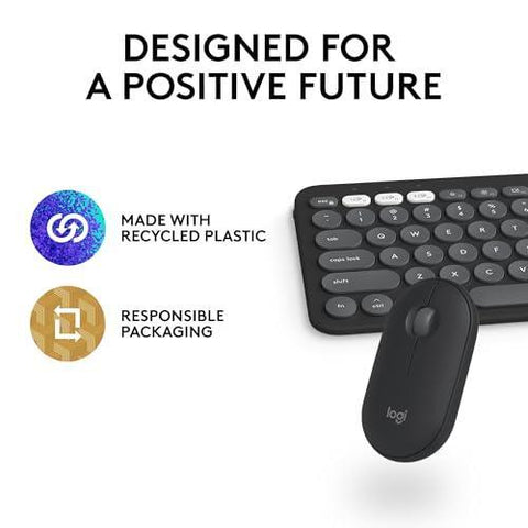 - A Design Choice to Feel Good About: Plastic parts include certified post-consumer recycled plastic (1); Pebble Keys 2 K380s for Mac minimum 49% and Pebble Mouse 2 M350s minimum 58%