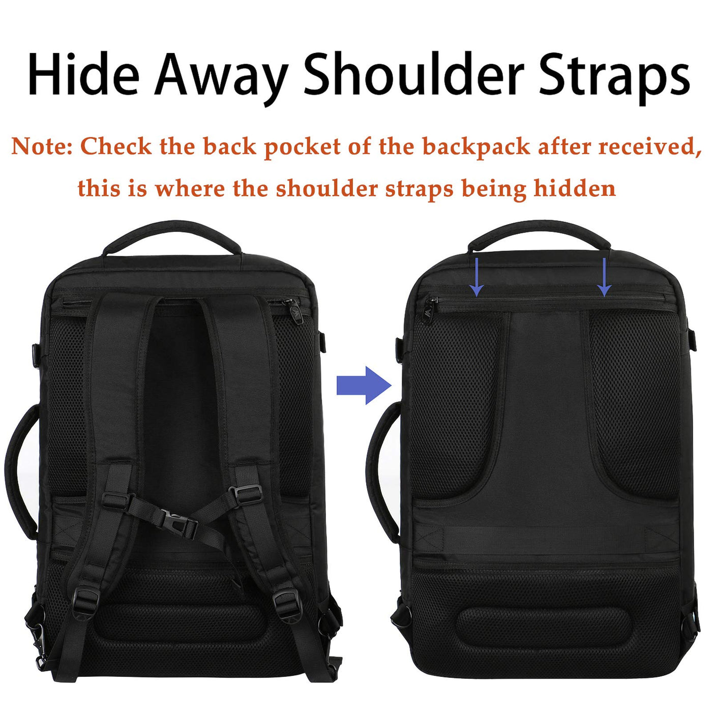- Convertible Design: Dimensions 19*13*8inch, Lightweight 1Kg(2.2lb) The carry on backpack is designed with hideaway padded shoulder straps which can be easily stored away in zippered back panel, transforming this vacation backpack from carry-on duffle to briefcase style and provide you a more flexible carrying experience. A luggage strap on the back is designed to fit on luggage/suitcase, for easier carry on international travel or cruise