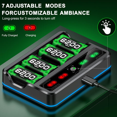 Mocagen 4 Pack 6200mAh Rechargeable Battery Pack for Xbox Series X|S/Xbox One/Elite Controller Charging Station with Touch-Sensor Light Strip, 30+hrs Playtime, Overcharge Protection