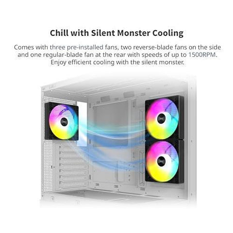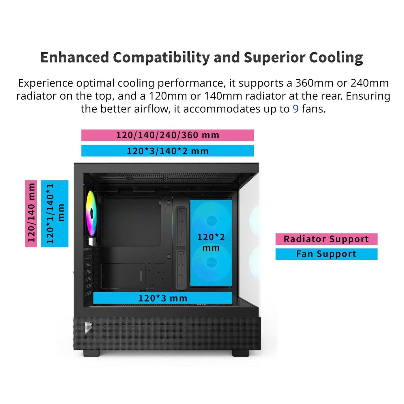 - Equipped with 3 pre-installed ARGB fans, with a maximum speed of 1500 RPM—2 reverse-blade fans on the side and 1 regular-blade fan at the rear. Supports up to 9 fans in total, providing users with optimal cooling performance.