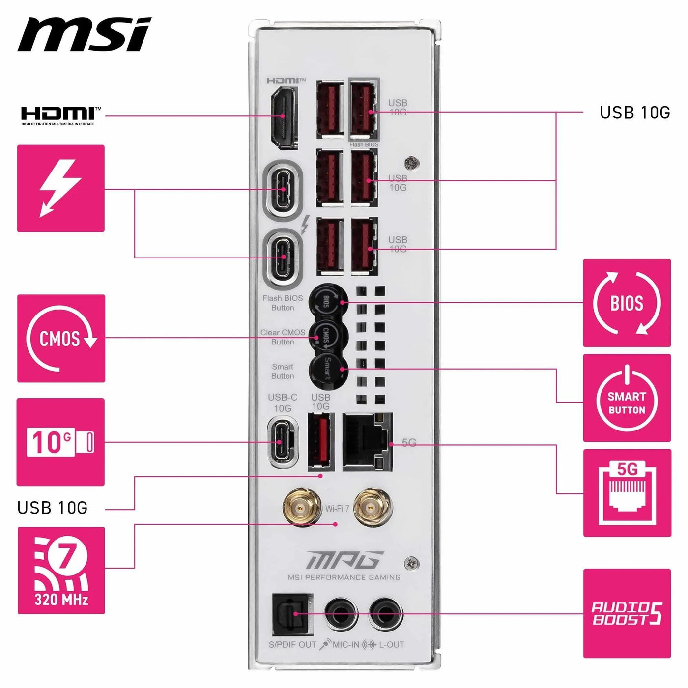 - ULTRA CONNECT - Network hardware includes a full-speed Wi-Fi 7 module with Bluetooth 5.4 & 5G LAN; Rear ports include Thunderbolt 4 Type-C 40Gbps with display output and 7.1 USB High Performance Audio with Audio Boost 5 (supports S/PDIF output)