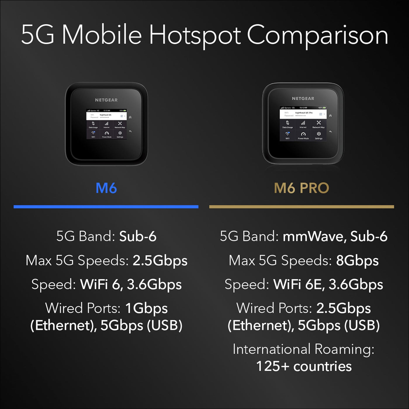 Details: Experience blazing fast 5G internet with speeds up to 2.5Gbps at home or on the go. The NETGEAR® Nighthawk® M6 Mobile Router features In-Home Performance mode to boost WiFi coverage up to 2,000 sq. ft. at home or, for max coverage and speed, connect M6 to your router or mesh system and use as your primary internet connection for up to 32 devices. Get exceptional performance with fast 3.6Gbps WiFi 6 speeds and 1 Gig Ethernet port for a wired connection to a WiFi router, mesh system, laptop or other wired devices. Reliable and secure, the M6 provides WiFi service wherever you go. The simple-to-use 2.4” LCD touch screen lets you conveniently monitor data usage, see WiFi name/password, mobile signal strength, and manage device and network settings. Unlocked to work on 5G and 4G LTE and with all providers; certified with AT&T and T-Mobile.